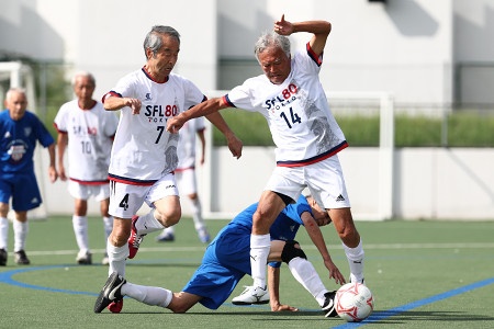 70歳以上のサッカー国際大会が東京・駒沢公園で開催された。米国、ドイツなどから約450人が参加。今大会で初めて80歳以上の部の試合が行われ、肩をぶつけながらボールを奪い合うなど熱戦が繰り広げられた。 【時事通信社】