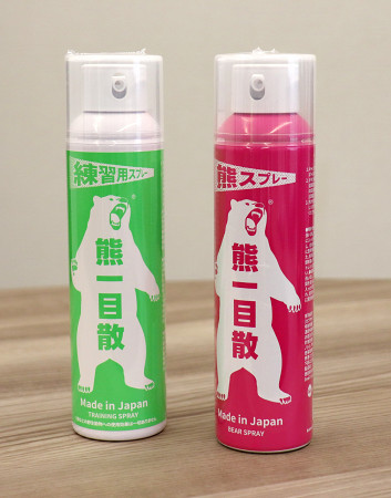 クマによる死者数が過去最悪を記録する中、徳島県阿南市の企業が撃退スプレーを開発した。写真右は、クマ撃退スプレー「熊一目散」。左は練習用スプレー=10月撮影、同市 【時事通信社】