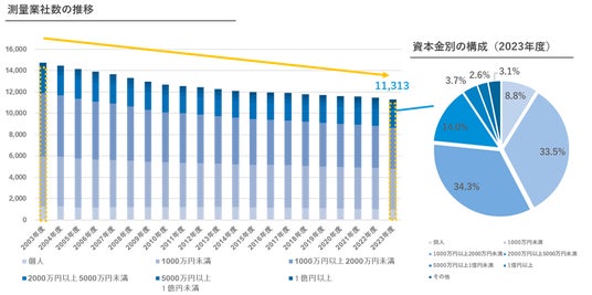 測量業界の市場規模(契約金額)は公共事業においては20年間で約10%増加し、2024年度で約734億円、民間事業においては2008年度に急落がありつつも徐々に回復し2024年度で約173億円と、ともに順調に推移しています。一方で、測量業者は2003年度をピークに21年連続で減少しており、2023年度末の測量業登録業者のうち95%が資本金1億円未満の中小企業です。