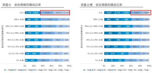 測量士は直近10年間で約2割減少しており、年齢層は50歳以上が6割超を占め、30~40歳台の減少が顕著となっています。一方、測量士補は微減傾向であるものの、全体として測量士に比べ安定傾向にあり、年齢層も50代以上は4割程度となっています。また、測量士・測量士補ともに従業員数の少ない小規模企業であるほど50代以上の高齢資格者への依存度が高い傾向にあり、中小企業を中心に高齢化が進行しています。