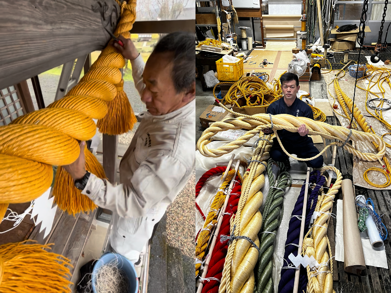 保護糸不要という特徴は、単なる見た目の問題ではありません。神社の現場では、氏子の高齢化が進み、しめ縄の交換作業を担う人手の確保が年々困難になっています。従来のしめ縄では、設置前に保護糸を一本一本丁寧に外す作業が必要で、大型のしめ縄になるほど時間と労力がかかりました。