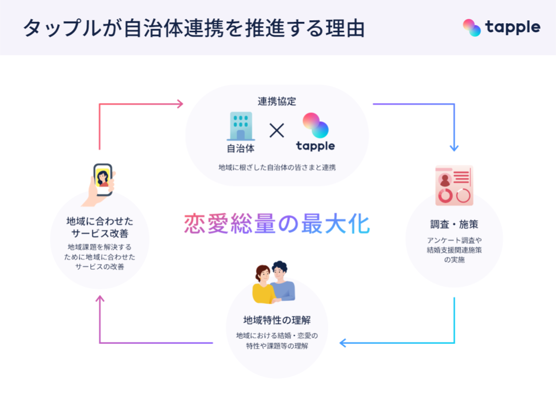 このような中、これまでに「タップル」では佐賀県有田町、佐賀県嬉野市、三重県、神奈川県、北海道、兵庫県姫路市、東京都江戸川区、福井県、富山県氷見市、香川県、山梨県北杜市、高知県と連携協定を締結し、安心・安全なマッチングアプリの啓発および適正利用の促進による少子化問題の解決に向けた貢献に取り組んでまいりました。