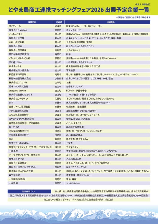 富山県商工会連合会(所在地:富山県富山市、会長:宮本光明)は、県内12商工会、関連機関と連携して2026年2月26日(木)に富山県中小企業研修センターにて「とやま農商工連携マッチングフェア2026」を開催いたします。