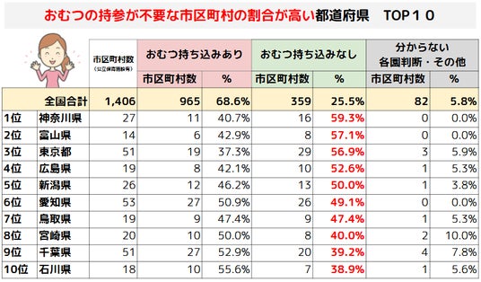 保護者がおむつの持参をしなくていい市区町村は全国で359に上り、昨年の191から大幅に増加しました。中でも神奈川県では、約6割の市町でおむつの持参が不要となっており、全国平均(25.5%)を大きく上回る結果となりました。次いで、富山県(57.1%)、東京都(56.9%)と続いており、地域によって取り組みの進展に差が見られる一方、全国的に見直しの動きが広がっています。