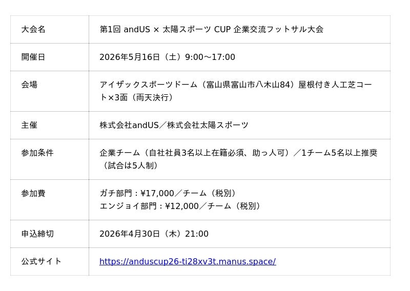 株式会社andUS(本社:富山県富山市、代表取締役社長:廣岡伸那、以下「andUS」)は、株式会社太陽スポーツと共同開催する「第1回 andUS × 太陽スポーツ CUP 企業交流フットサル大会」(2026年5月16日開催)について、参加チームの最終募集を2026年4月30日(木)21:00で締め切ることをお知らせいたします。